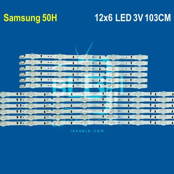 بک لایت تلویزیون سامسونگ مدل 50H دارای 6 شاخه می باشد بطوریکه  هر شاخه شامل 12 ال ای دی با ولتاژ 3 ولت است. طول هرشاخه 103 سانتی متر می باشد.