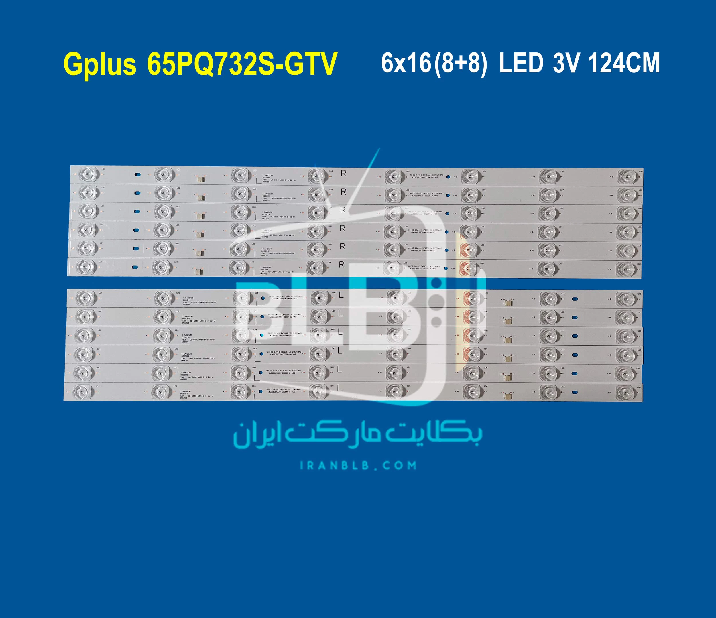 بک لایت تلویزیون جی پلاس 65PQ732S-GTV دارای 6 شاخه می باشد بطوریکه  هر شاخه شامل 16 ال ای دی با ولتاژ 3 ولت است. طول هرشاخه 124 سانتی متر می باشد.