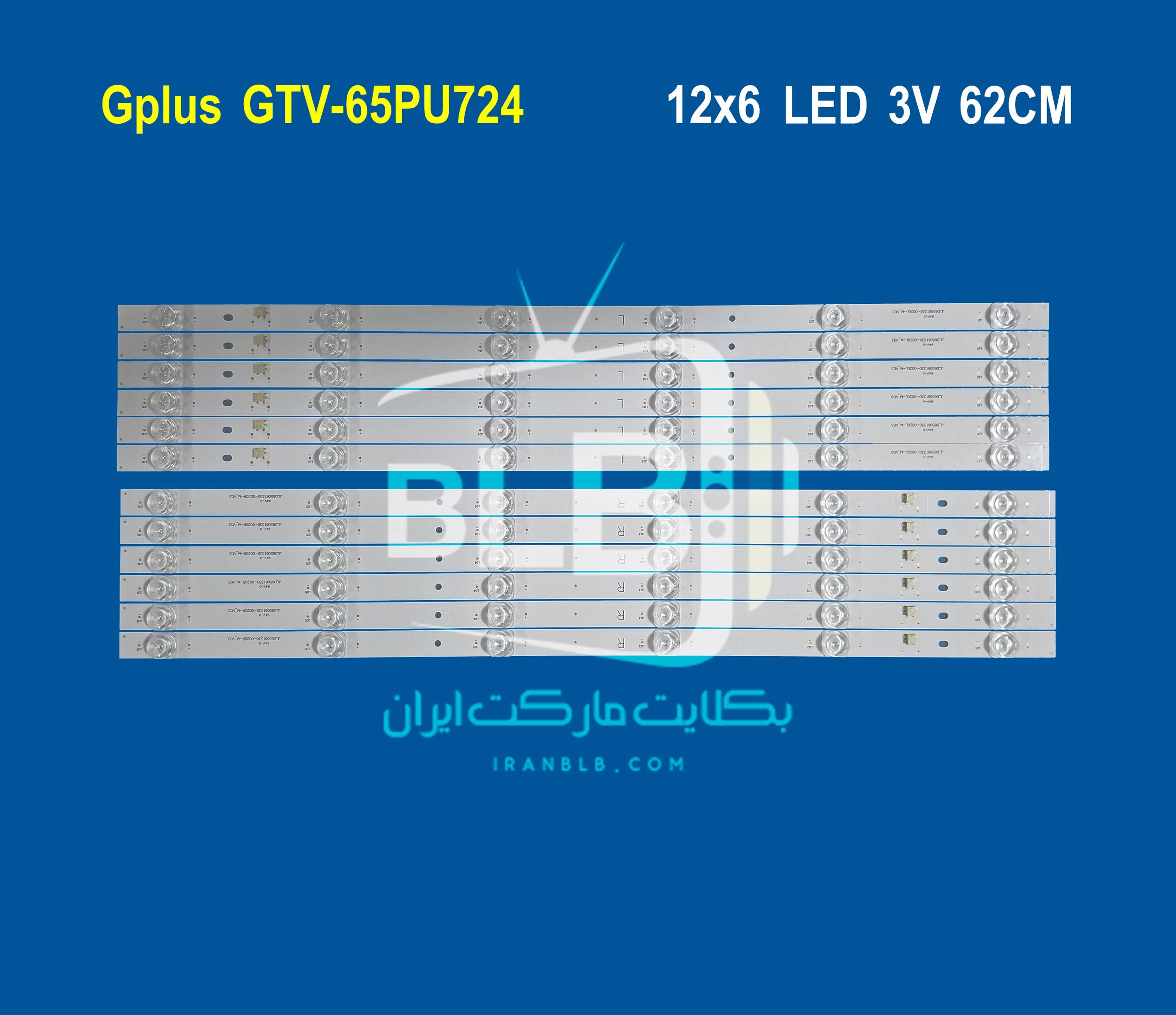 بک لایت تلویزیون جی پلاس GTV-65PU724 دارای 12 شاخه می باشد بطوریکه  هر شاخه شامل 6 ال ای دی با ولتاژ 3 ولت است. طول هرشاخه 62 سانتی متر می باشد.