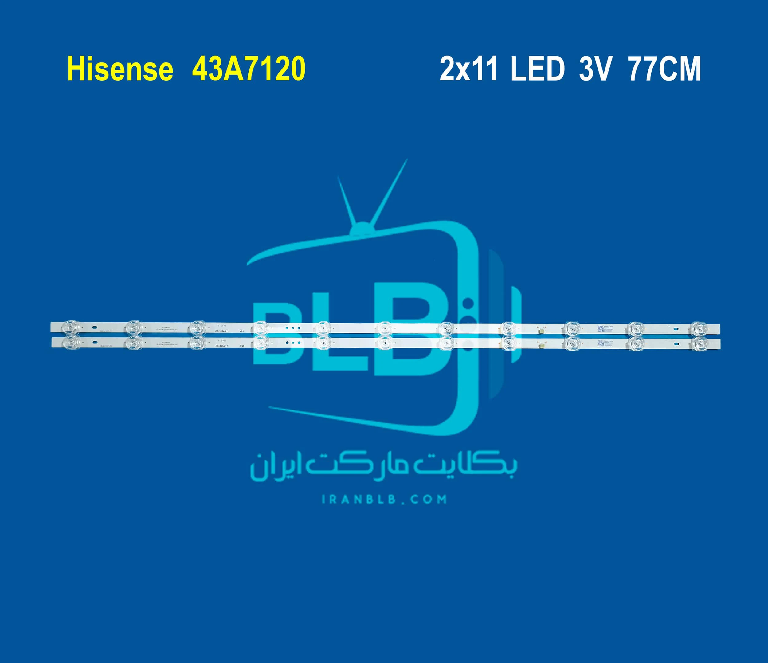 بک لایت تلویزیون هایسنس 43A7120 دارای 2 شاخه می باشد بطوریکه هر شاخه شامل 11 ال ای دی با ولتاژ 3 ولت است. طول هرشاخه 77 سانتی متر می باشد.