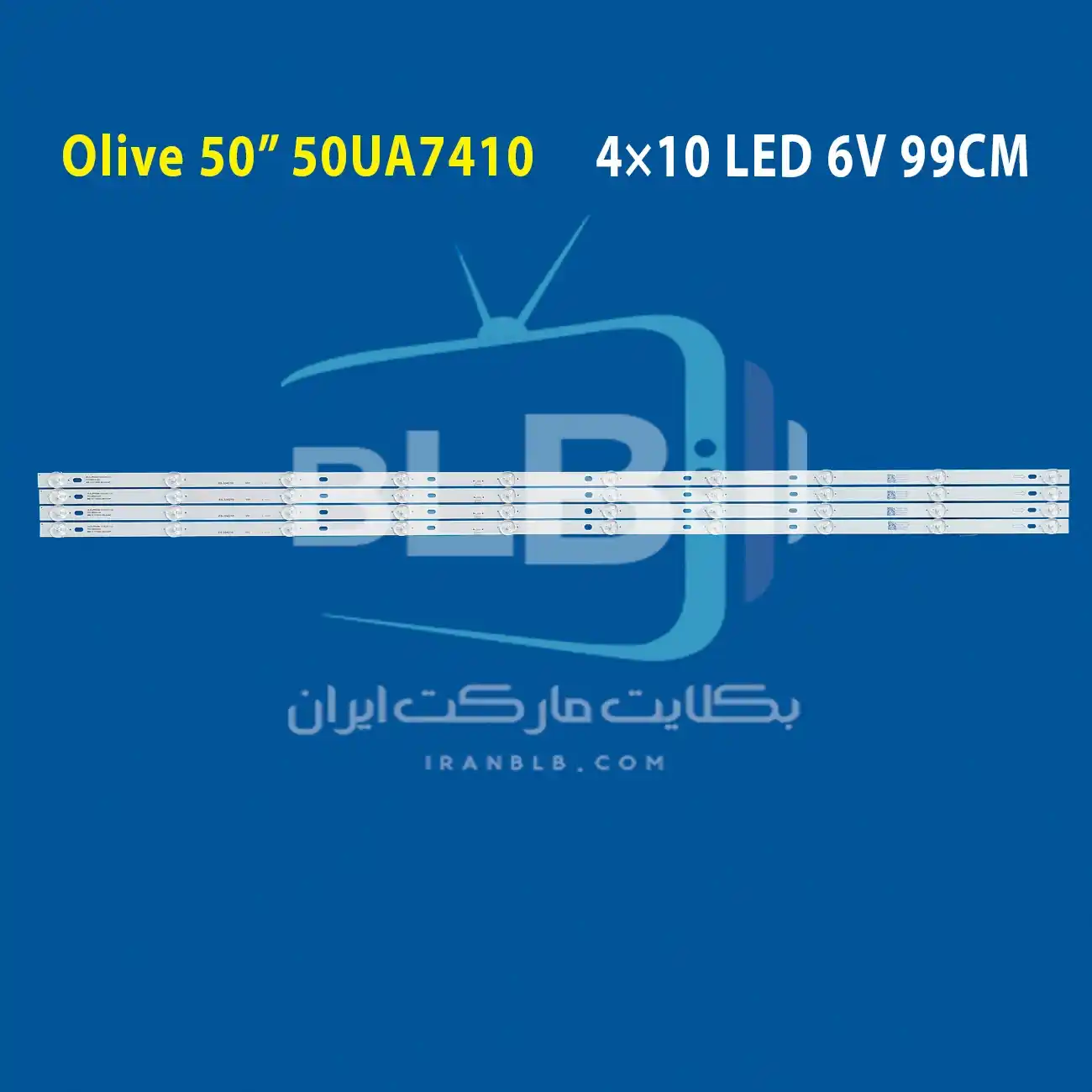 بکلایت الیو مدل 50UA7410 50UF7410 مناسب تلویزیون‌های50 اینچ الیو olive بوده و دارای 4 شاخه  است که در هر ردیف 10 عدد LED لنزدار با ولتاژ 3 ولت به‌کار رفته است، این بک لایت از برد آلومینیومی PCB ساخته شده که به دفع بهتر حرارت کمک می‌کند و در پشت شاخه‌ها چسب سیلیکونی آبی رنگ مخصوص نصب شده است، همچنین با نوردهی یکنواخت، بدون ایجاد سایه و هاله، کیفیت تصویر مطلوب و روشنایی استاندارد را فراهم می‌کند.
