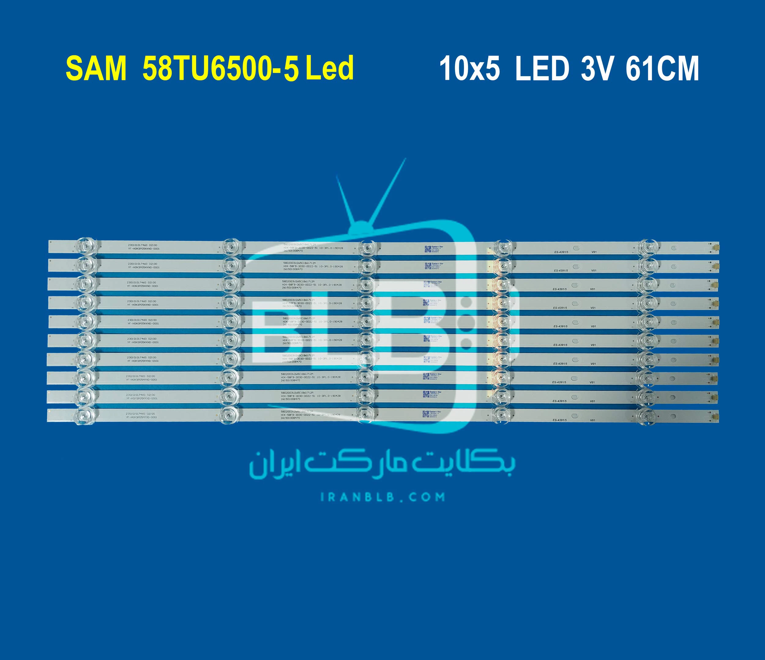بکلایت تلویزیون سام 58TU6500-5 Led دارای 10 شاخه می باشد بطوریکه هر شاخه شامل 5 ال ای دی با ولتاژ 3 ولت و به طول 61 سانتی متر می باشد. همچنین در این مدل یک شاخه از بکلایت دارای دو سوکت می باشد.