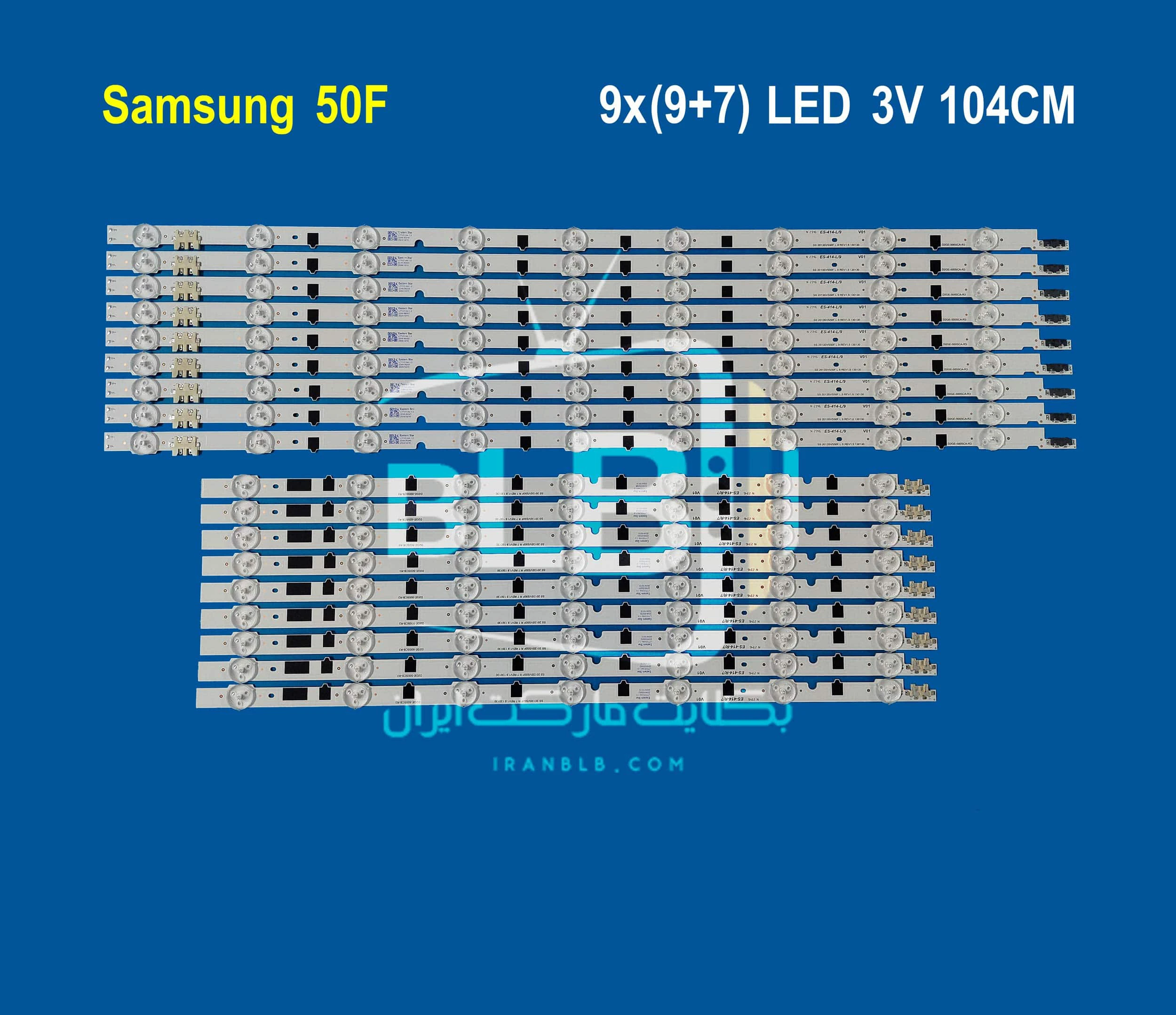بک لایت تلویزیون سامسونگ 50F دارای 9 شاخه می باشد بطوریکه  هر شاخه شامل 7+9 ال ای دی با ولتاژ 3 ولت است. طول هرشاخه 104 سانتی متر می باشد.