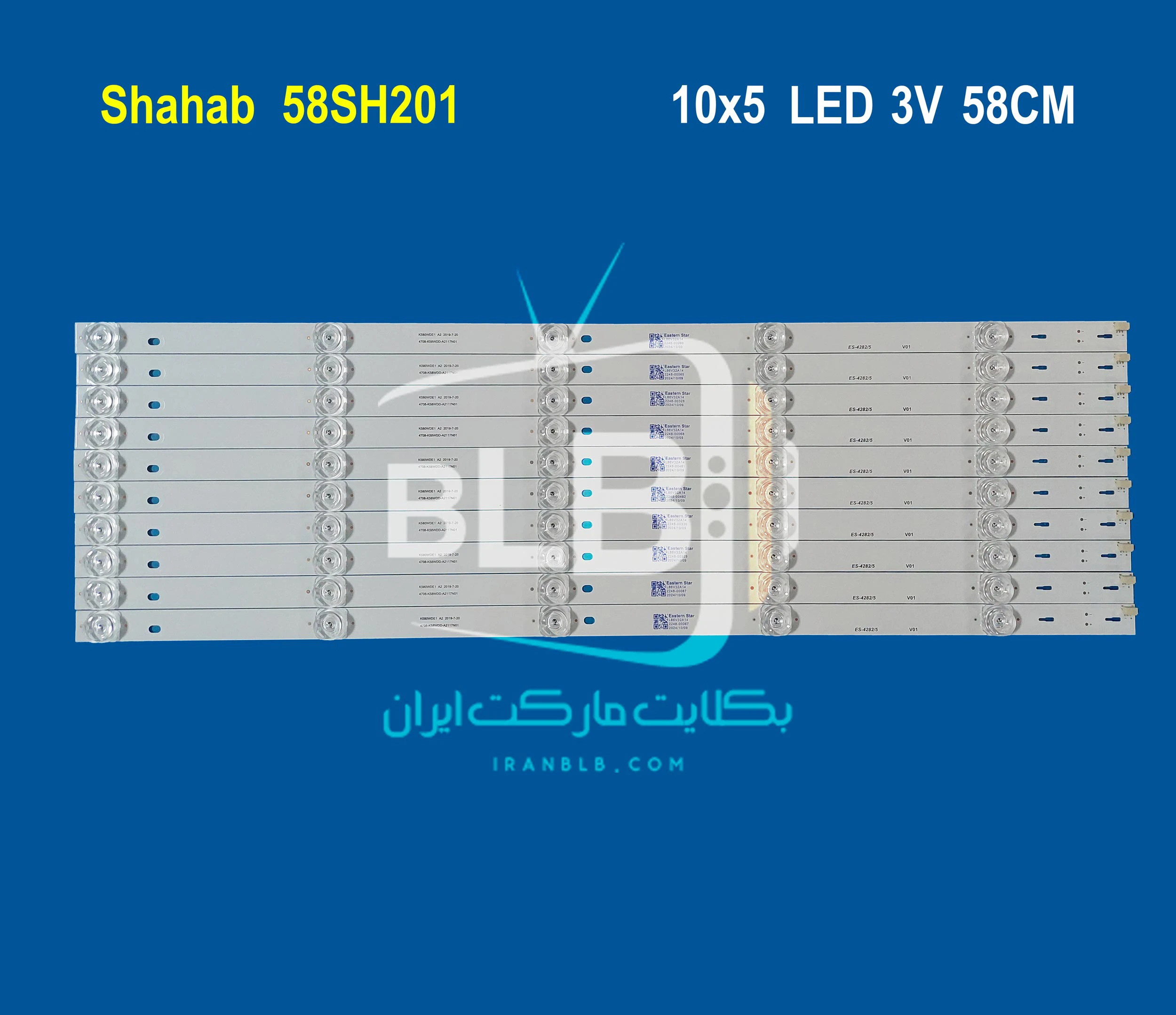 بک لایت تلویزیون شهاب 58SH201 مناسب تلویزیون‌های 58 اینچ شهاب shahab بوده و دارای 10 شاخه  است که در هر ردیف 5 عدد LED لنزدار با ولتاژ 3 ولت به‌کار رفته است، این بک لایت از برد آلومینیومی PCB ساخته شده که به دفع بهتر حرارت کمک می‌کند و در پشت شاخه‌ها چسب سیلیکونی آبی رنگ مخصوص نصب شده است، همچنین با نوردهی یکنواخت، بدون ایجاد سایه و هاله، کیفیت تصویر مطلوب و روشنایی استاندارد را فراهم می‌کند.